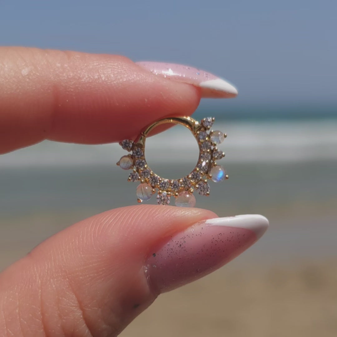 Inspired by the sea nymph and divine spirit in greek mythology, our Calypso Daith Hoop represents the enchanting energy of the ocean and its captivating beauty. Adorned with five magical Rainbow Moonstone cabochons which glow like individual planets, encapsulated with sparkling Cubic Zirconia.
