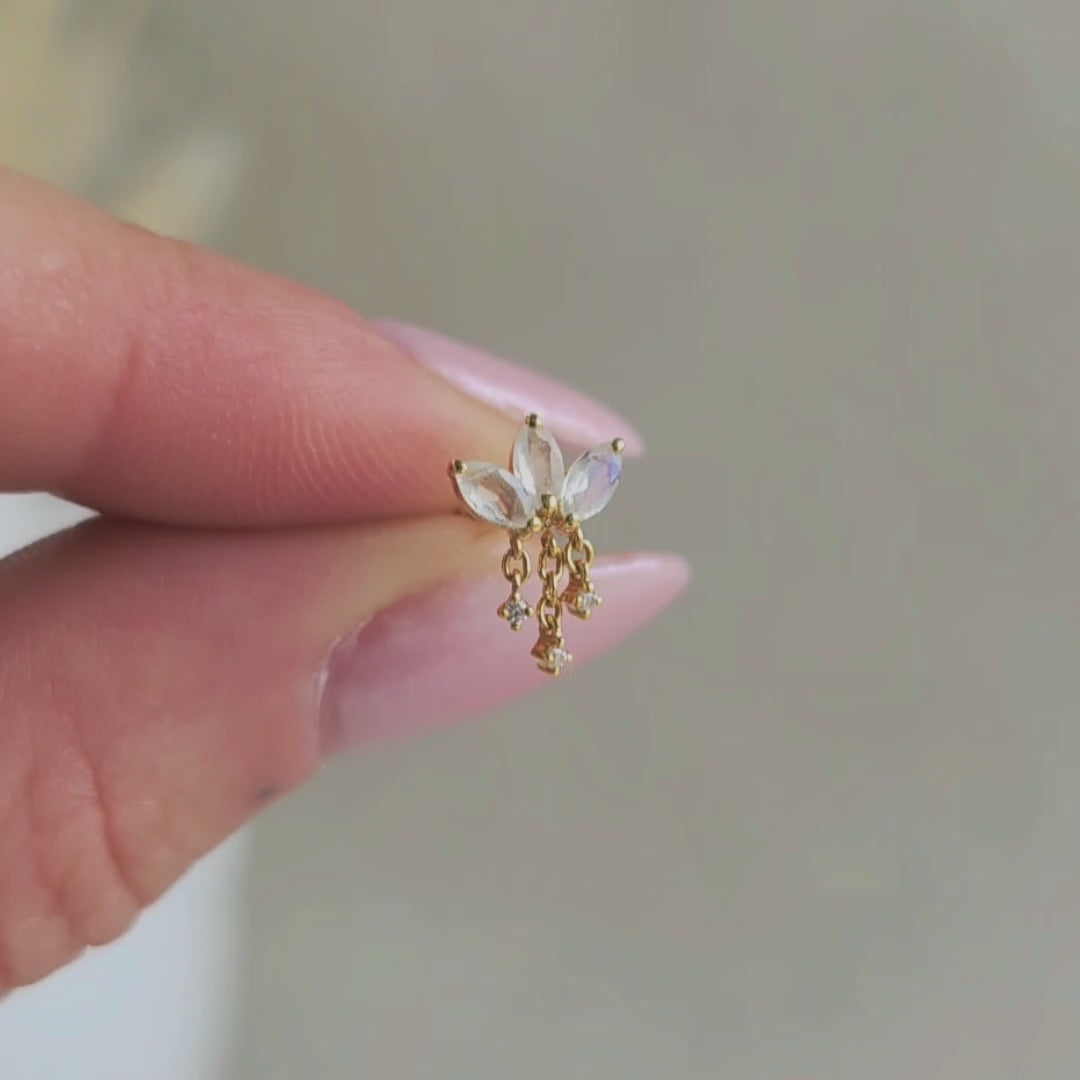 Meet the heavenly Leilani, the big sister of our most-loved Lani style. We've been excited to design a hanging chain stud and this magical adornment made our dreams come true. Leilani features three marquise-cut Rainbow Moonstones with a trio of dangly chains, finished with a dainty crystal that adds subtle sparkle.